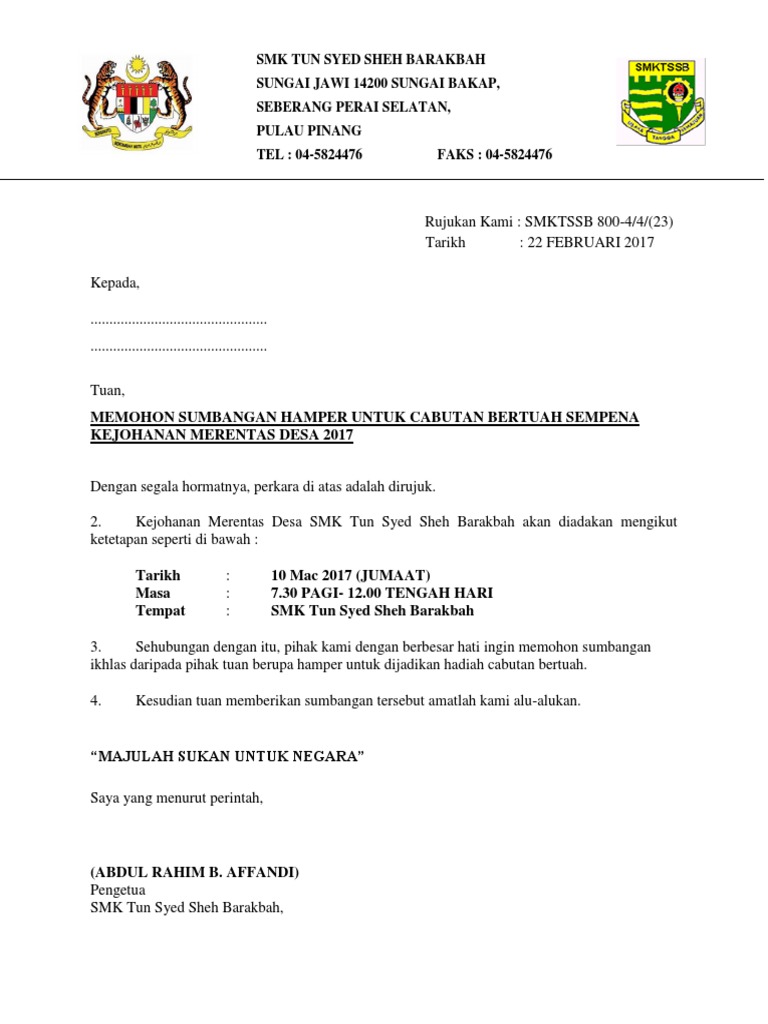 Contoh Surat Sumbangan Surau Sekolah